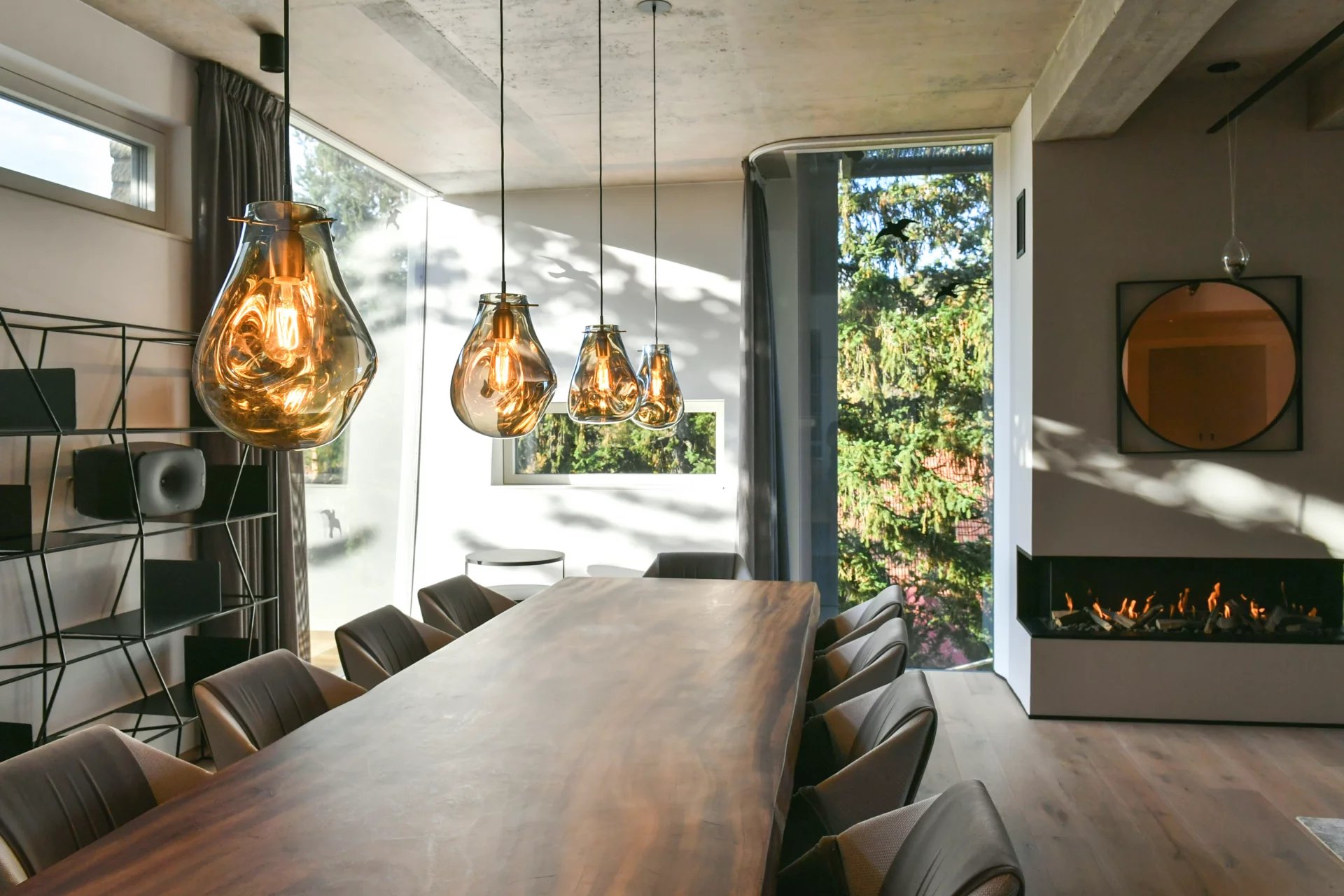 - grosszügiger Wohn- & Essbereich mit Cheminée, raumhoher - Verglasung und Ausblick auf den farbenprächtigen Umschwung